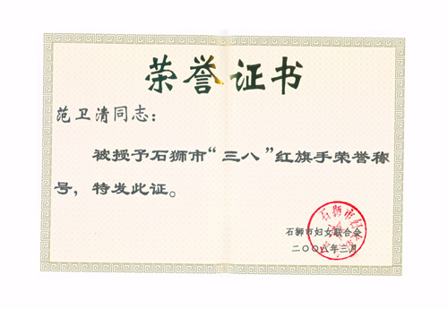 | 范衛(wèi)清同志被評為“市優(yōu)秀務(wù)工婦女”及“三八”紅旗手榮譽(yù)稱號 |